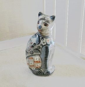 Tijuana Cat: Worthless from a money point of view, but infinitely valuable for the memory of 2-hour trip to Tijuana with my daughter when she was only 9. We rode by train from San Diego, and at a vendor’s tent near the border we found this paper-mache’ cat on sale for $10. I’d heard you should bargain with vendors in Mexico, so I offered $3; he countered with $4, and we got it! Daughter was horrified that I’d been so cheap, but we both took very good care of it in the ensuing years. Our real cat, Nicki, was very leery when first she spied it but eventually figured out that it was probably a mummy and lost interest within a day. Tijuana Cat will be passed on.