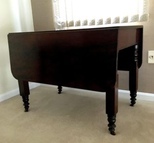 Mahogany drop leaf table from Aunt Elizabeth: According to an appraiser, worth a lot, but to me, not much at all. Aunt Elizabeth was my Grandpa Doc’s second wife — a wonderful, accomplished, and kind woman, but not one I knew well. There are no stories about this table. I just inherited it after Aunt E. had died and kept it because my mother said it was valuable. So, unless our new abode has a place for just this piece and no other it will be consigned to consignment. Even if it does stay with me till the end, I give permission to all descendents to turn it into hard cash for college or some other important use.